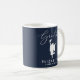 Individuell dunkelmarineblaue Tasse für ihren Abschluss mit einer Illustration eines Absolventen, der in ihrer Kappe und ihrem Kleid "Graduate" in einem eleganten weißen Drehbuch feiert, und ihren Namen und ihr Klassenjahr in schlicht weißer Typografie.