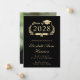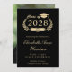 Moderne Ankündigung in Schwarz-Uni-Abschluss mit "Class of" in einer leicht vergoldeten Abbildung eines Lorbeerkranzes mit einem Grade Cap Topper und Diplom, dem Namen des Absolventen in einem eleganten Leichtgold-Drehbuch und ihrer Uni oder Universität, Dur, Ehren oder Zukunftspläne. Das Foto des Absolventen füllt die Rückseite der Karte aus.
