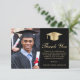 Eleganter schwarzer Abschluss Dankeschön-Karte mit einer Goldgrad-Kappe, ein Foto des Absolventen, "Danke" in einem klassischen Gold-Skript, und Ihr individuelles Dankeschön-Nachricht und den Namen des Absolventen in der modernen Serif Gold Typografie.