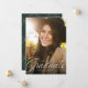 Ein klassischer und eleganter Script-Absolvent in Weiß sitzt am unteren Ende eines senkrechten Fotos. Der benutzerdefinierte Text enthält Platz für den Namen des Absolventen und auch die Schule und das Jahr Details. Der grüne Backer des Jägers hat ein einfaches Rastermuster, und die Farbe kann durch Klicken auf "Weitere Anpassung" geändert werden. Mit diesem Design verkünden Sie die Leistung Ihres Absolventen an Freunde und Familie!