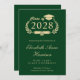 Elegante Ankündigung eines grünen Uni-Abschlusses mit "Class of" in einer leicht vergoldeten Illustration eines Lorbeerkranzes mit einem Grad-Oberteil und Diplom und dem Namen des Absolventen in einem leichten Goldskript. Fügen Sie ihre Schule, Hauptfach, Ehren oder künftige Pläne.