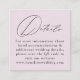 Ermöglicht es den Gästen, mit diesen modernen QR-Code Hochzeitsdetails Einzel-Karten einfach mehr Informationen über Ihre Hochzeit zu finden. Die elegante Hochzeitsdetails-Karte zeigt "Details" in einem schwarzen Kalligraphieskript, das einem lavender lila Hintergrund widerspricht. Personalisieren Sie die Karte mit Ihrer Hochzeitswebsite-Adresse und individuellem Text. Auf der Rückseite der lavender wedding details card finden Sie einen QR code, mit dem Sie Informationen über hotel übernachten können, Anfahrtsbeschreibungen, Kleiderordnung, Online-UAWG, etc.