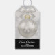 Geschenke Tags mit einem magischen Urlaubsdesign. Mit einem silbernen Weihnachtsball mit Schneeflocken dekoriert und mit einem hübschen Silberbogen fertig. Der Hintergrund ist eine silberne Lichtillustrierung mit eleganten Sternen verstreut.