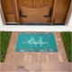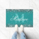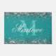 Eleganter Silver Glitzer Aquamarin Blue Green und White Monogram große Doormat mit einem anpassbaren Kalligraphieskriptnamen und fett formatierter Vorlage. Eine Glam, personalisierte große Tür für Ihr neues Zuhause- oder Studentenzimmer.
