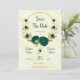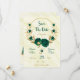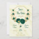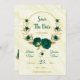 Romantische smaragdgrüne Blume und goldene Blätter auf Goldkranz Save the Date Einladung Die Einzelheiten des Glitzer werden simuliert