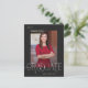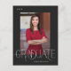 Diese elegante Abschluss-Ankündigungskarte verfügt über moderne Graduiertentypografie auf schwarzem Hintergrund, ein Foto und Uni- oder Abschluss-Details mit Rücksendeadresse.