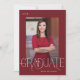 Diese elegante Rot-Abschluss-Ankündigungskarte bietet moderne Graduiertentypografie mit einem Foto auf der Vorderseite und einem vollen Foto auf der Rückseite der Karte.