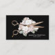 Elegante Friseurkarte. Design mit zwei goldenen Frisierscheren der Rose, Weiß & Grau und leuchtend rosa Blumenarrangements. Personalisieren Sie Ihren Namen und Titel auf der Vorderseite und Details auf der Rückseite. Ideal für Friseure, Friseure, Friseure, Friseursalons etc.