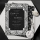Art Nouveau ist ein Kunststil, der zwischen 1890 und 1910 in ganz Europa und den Vereinigten Staaten blühte. Diese eleganten, weiße und weiße Vintage-Einladungen zeichnen sich durch ein verziertes Design mit schwarzem Hintergrund und einer dazwischen liegenden Mustertextur aus. Der Rücken hat ein weißes quadratisches Design auf schwarz.