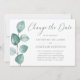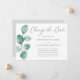 Wenn Ihr Hochzeitstag verschoben wird, diese elegante Hand gemalt Aquarell Eukalyptus Ändern Sie die Date-Karte wird Ihre Freunde und Familien in Stil informieren. Dieses moderne Design-Template verfügt über eine einfache Aquarell Eukalyptus-Zweigstelle auf der links mit Ihren Daten auf der rechten Seite, damit Sie personalisieren können. Designed by artist ©Susan Coffey.
