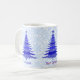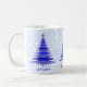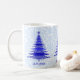 Dieses elegante, einzigartige, moderne, stilvolle, handgezeichnete Design besticht durch einen Weihnachtsbaum mit aufwändigen Details in blauer Farbe auf hellblauem Hintergrund mit Schneeflocken. Das Design hat auch einen Namen in der modernen Topografie, der auf Ihre Bedürfnisse personalisiert sein kann. Diese Tasse eignet sich hervorragend für Feste und eignet sich hervorragend als Geschenk für Ihre Freunde und Familie.