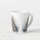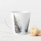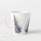 Hübsche Latte Tasse mit Aquarellblau und weißem Weihnachtsbaum dekoriert mit Gold , extravaganten Sternen, Schneeflocken, Ziergegenstände, Perlen und Bausteine. Es gibt einen glänzenden Goldsternbaum oben.