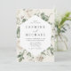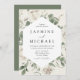 Die elegante, weiße Blumen-Hochzeitseinladung enthält Ihre Namen und Hochzeitsdetails, gerahmt von gemalten Aquarellfarben Eukalyptus-Blätter, üppigem Grün, Rose in Weiß und Creme und lisianthus-Blume.