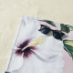 Eine zarte Abbildung mit Blume aus weißem Hibiskus mit einem lebhaften grünen Blätter Set vor einem weichen rosa Hintergrund. Die Blume sind sehr detailliert, mit subtilen Schattierungen und gelben Pop in den Farben, die die natürliche Schönheit noch verstärken. Die sanften Farbtöne und die elegante Komposition rufen ein Gefühl von Ruhe und Anmut hervor, perfekt für naturgetreue Designs oder Blumensammlungen.