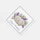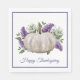 Papierservietten zum Thema Erntedank mit einem dünnen lila Rand um den Rand und schöne Grafiken eines weißen Kürbis und violetten Blumen. Lila Text liest Happy Thanksgiving und kann personalisiert sein, zu lesen, was Sie gewollt.