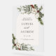 Herzlich willkommen auf Ihrer Hochzeit mit diesem schönen Schild, das einen Rahmen von Winterfloralen und eleganten Evergreens bietet. Fügen Sie den Ehrengast mit dem Namen, dem Duschdatum und dem persönlichen Willkommenstext unter Verwendung der angegebenen Felder hinzu.