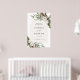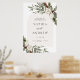 Herzlich willkommen auf Ihrer Hochzeit mit diesem schönen Schild, das einen Rahmen von Winterfloralen und eleganten Evergreens bietet. Fügen Sie den Ehrengast mit dem Namen, dem Duschdatum und dem persönlichen Willkommenstext unter Verwendung der angegebenen Felder hinzu.