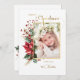 Mit diesem klassischen Weihnachtsgebirge-Design wird Ihr Foto zu einem unvergesslichen Erlebnis. Es verfügt über eine Single-Portrait-Seitenfoto-Vorlage mit einem goldenen Imitat-Rahmen umgeben von lebhaften und festlichen roten, grünen und goldenen Winterbotanicals und maßgeschneiderten Gold Frohe Weihnachtskalligraphie-Gruß. Enthält bearbeitbare Textfelder. Auf der Rückseite befinden sich bearbeitbare Text- und Personalisierungstexte, ein leeres Element mit goldener Grenze und eine ergänzende Blumenverzierung.