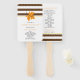 Elegante Hochzeit im Herbst Zeremonie und Party Programm Handfan. Es ist mit einem schönen orangefarbenen Ahornblatt und braunen und weißen Streifen versehen. Ihr Text ist auf einem weißen Rahmen.