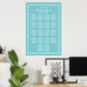 Das elegante Hochzeitsstempelposter-Design umfasst ein Monogramm der Braut- und Bräutigam-Namen und das Hochzeitsdatum, einen benutzerdefinierten Vorlagentext für Tischnummern und Gastnamen sowie einen dekorativen, weißen Rahmen für die Rollen. Aqua / Türkis blauer Hintergrund und weiße Textfarben können angepasst werden.
