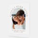 Elegantes mattiertes Acryl-Begrüßungszeichen für Ihre Verlobungsfeier, Probe-Dinner, Hochzeitsfeier und Empfang mit Ihrem Foto in einem Bogen-Rahmen gezeigt, "Happily Ever After" in klassischer Goldschmiedetypografie, und Ihre Namen und Hochzeitsdatum in einfacher Goldtypografie.