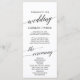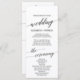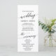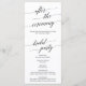 Dieses elegante Schwarz nach der Zeremonie Hochzeitsprogramm ist perfekt für eine einfache Hochzeit. Das neutrale Design besticht durch eine minimalistische Karte, die mit romantischer und skurriler Typografie dekoriert ist. Geben Sie den Namen der Braut und des Bräutigams, das Hochzeitdatum und den Ort, Dankeschön-Nachricht, Dienstordnung, Cocktailstundeninfo und Brautparty ein.