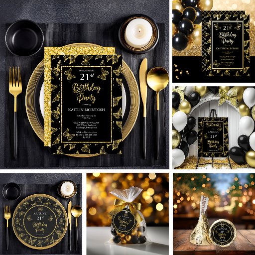Moderne, elegante und klassische Schwarz-Imitat-Gold-Glitzer Schmetterlinge 21. Geburtstag Party Design. Composite by Holiday Hearts Designs (Rechte vorbehalten).
