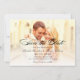 Diese eleganten Hochzeitskarten Ankündigung Datum freihalten ein klassisches Schwarz-Text-Overlay mit Verlobung Foto Hintergrund. Auf der weißen Rückseite der Karte erscheint ein goldfarbenes Schweizer Polka-Punktmuster.