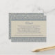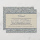 Geben Sie Ihren Hochzeitsgästen hilfreiche Informationen, wenn sie an Ihrer Hochzeit teilnehmen möchten. Dieses elegante Design besticht durch ein blau-beige Damast-Muster mit einem zweifarbigen Streifen beige Streifen und Ihrem gewünschten Text. Dieses Beispiel Text Vorlage zeigt Hotelinformationen und Hochzeitswebseiten Informationen. Die Rückseite der Karte hat den Namen der Braut und des Bräutigams und das Hochzeitdatum. Dieser Text kann nach Ihren Vorgaben bearbeitet werden.
