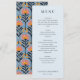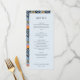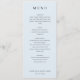Dieses elegante Hochzeitsmenü verfügt über ein sauberes, minimalistisches Design mit einem weichen pastellblauen Hintergrund und tief navyblauem Text. Der Aufbau ist strukturiert mit klaren Abschnitten für Vorspeisen, Salat, Hauptgericht und Dessert, die jeweils durch fette serifenbetonte Überschriften und leicht lesbare serifenlose Schriften hervorgehoben werden. Der moderne Stil betont Einfachheit und Eleganz und ist somit perfekt für formelle Anlässe. Der großzügige Freiraum verbessert die Lesbarkeit, während die anpassbaren Platzhalter eine Personalisierung ermöglichen und sicherstellen, dass dieses Menü sowohl funktional als auch stilvoll für jede Feier ist.