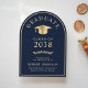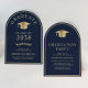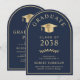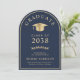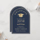 Elegante bogenförmige Ankündigung und Party Einladung des blauen Uni-Abschlusses mit Goldgradmütze und klassischer Goldserf-Typografie für den Namen, das Klassenjahr, die Uni oder die Universität, den Abschluss und die Dur- oder Ehrensymbole. Fügen Sie auf der Rückseite Ihre Party-Details hinzu.
