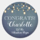 Elegante blaue Überraschungs-Party-Aufkleber für Umschlag Aufkleber oder Geschenktaschen mit schimmernder Saitenbeleuchtung und einer Kombination aus Schrift und offener Gesichtstypografie auf dunkelblauem Hintergrund, geschlossen von hellblau in der Mitte bis dunkelblau an den äußeren Rändern für einen weichen, schimmernden atmosphärischen Effekt. Ideal für die Pensionsstimmung von Männern oder Frauen.