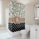 Dekor Ihr Badezimmer in der Art mit diesem "elegantes Blumenolivgrünes Grün-Monogramm-personalisierten Duschvorhang damast-Polka-Punkt-TANs". Sie können Ihr Monogramm, Namen oder Text auf diesem Entwurf hinzufügen. Es ist einfach und Spaß.