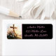 Dieses Adressetikett zeichnet sich durch ein ruhiges und schönes Design aus. Auf der links Seite sieht man ein Holzkreuz, das von einer Vielzahl blühender Blume umgeben ist, darunter Gänseblümchen, Set gegen einen zarten, pastellfarbenen Himmel. Auf der rechten Seite des Labels befindet sich ein schwarzer Hintergrund mit elegantem, kursiv rosa Text, der die Adressdetails anzeigt. Die Kombination aus dem Blumenkreuz und dem ausgefeilten Text macht dieses Etikett sowohl optisch ansprechend als auch sinnvoll.