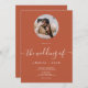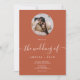 Einfache elegante boho terracotta weißen Foto Skript Hochzeitseinladung mit dieser klassischen und eleganten Kalligraphie die Hochzeit von Script in Terracotta Erdton und Weiß. Füge das Foto eines Paares in einer Kreismaske hinzu.