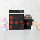 Elegantes botanisches Muster auf schwarzem Hintergrund mit weißen Blättern, roten Beeren und komplizierten Blumendesigns in goldenen Akzenten, die ein festliches, dekoratives Gefühl erzeugen.