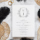 Eine elegante Hochzeitseinladung bietet ein botanisches Line Art Wappen mit Ihrem Monogramm. Personalisieren Sie mit allen wichtigen Details wie Ihren Namen, Hochzeitstag, Uhrzeit und Veranstaltungsort. Die Rückseite ist schwarz koordiniert