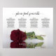 Dieses schöne Sitzdiagramm hat Tischbelegungen für 40 Gäste an 4 Tischen - 10 Personen pro Tisch. Das Design ist elegant, raffiniert, romantisch und chic, mit einem Single bordeauxrot, maronfarbene oder weinrote Rose, die im Wasser reflektiert. Der Titel lautet "Bitte finden Sie Ihren Tisch" in laky Skript-Kalligrafie, und es gibt Platz für die Namen des Paares und das Hochzeitstag. So können Sie Ihren Empfang wunderschön gestalten und gleichzeitig Ihre Tische leicht finden.