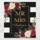Elegantes Watercolor Burgundy Marsala Blauer Blütenschwarz und weiß gestreifter Goldrahmen Wein und Sekt Flaschen Etiketten