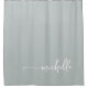 Elegante Feminine Minimalistisch Sage Green Monogram Name Script Signature Custom Personalisiert Bad Duschvorhang. Dieses Design mit Ihrem Vornamen in einem handgeschriebenen Stil Swash Schwanz Schriftart Signatur Typografie (oder Kalligrafie) auf schlanke grüne oder staubige grüne Hintergrund. Große stilvolle feminine Hauswärmeschenke, Jubiläum, Hochzeit, auch zum Geburtstag, Brautparty, Junggeselinnen-Abschied und Es ist für das Mädchen, das saubere minimalistische Dinge mag.