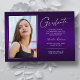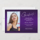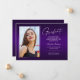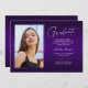Zwei zweiseitige, moderne und elegante Abschluss-Ankündigungskarten mit modernen Textelementen und einem eigenartigen handgeschriebenen Farbskript. Das Foto besteht aus zwei eleganten -Ansichtskarten. Die Fotos des Absolventen auf der Vorder- und Rückseite der Karte sind mit einem delikaten & minimalistischen Gradientenband (das Foto hinten ist perfekt Set und bereit gerahmt zu sein). Der Hintergrund ist ein besonderes Gradientendesign, das wunderbar lebendige Farbtöne von lila, von Violett bis hin zu Lavendel, schafft. Die Kartenvorderseite bietet personalisierte Textstellen für Informationen über Ihren Abschluss oder kann umformuliert werden, um diese Party Einladung zu einer Abitur zu machen. Ideal für Gymnasiasten, Unis und Studierende.