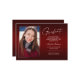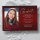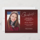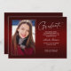 Zwei zweiseitige, moderne und elegante Abschluss-Ankündigungskarten mit modernen Textelementen und einem eigenartigen handgeschriebenen Farbskript. Das Foto besteht aus zwei eleganten -Ansichtskarten. Die Fotos des Absolventen auf der Vorder- und Rückseite der Karte sind mit einem delikaten & minimalistischen Gradientenband (das Foto hinten ist perfekt Set und bereit gerahmt zu sein). Der Hintergrund ist ein besonderes Gradientendesign, das wunderbar lebendige Rottönen von rubinrot bis tiefburgund schafft. Die Kartenvorderseite bietet personalisierte Textstellen für Informationen über Ihren Abschluss oder kann umformuliert werden, um diese Party Einladung zu einer Abitur zu machen. Ideal für Gymnasiasten, Unis und Studierende.