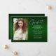 Zwei zweiseitige, moderne und elegante Abschluss-Ankündigungskarten mit modernen Textelementen und einem eigenartigen handgeschriebenen Farbskript. Das Foto besteht aus zwei eleganten -Ansichtskarten. Die Fotos des Absolventen auf der Vorder- und Rückseite der Karte sind mit einem delikaten & minimalistischen Gradientenband (das Foto hinten ist perfekt Set und bereit gerahmt zu sein). Der Hintergrund ist ein besonderes Gradientendesign, das wunderbar lebendige Grüntöne schafft, die von Smaragd bis tief im Wald und Jägergrün reichen. Die Kartenvorderseite bietet personalisierte Textstellen für Informationen über Ihren Abschluss oder kann umformuliert werden, um diese Party Einladung zu einer Abitur zu machen. Ideal für Gymnasiasten, Unis und Studierende.