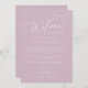 Dieses elegante, rosafarbene Hochzeitsgeschenk eignet sich perfekt für eine einfache Hochzeit. Das moderne minimalistische Design besticht durch zeitlose staubige Rose in Rosa und romantische Kalligraphie mit böhmischem Märchenstil, die sich perfekt für eine Hochzeit im Frühjahr oder im Sommer eignet. Auf der Vorderseite des Begrüßungstafels befindet sich ein Begrüßungsbrief und auf der Rückseite befindet sich die Zeitachse für die Hochzeitsreise. Diese Noten sind ideal für Hochzeiten in Urlaubsort und Begrüßungstaschen für Hotelgäste.