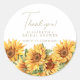 Lebhafte gelbe Sonnenblume blüht Bouquet-Rand mit schlankem Grün, das elegante boho schicke Frühling Herbst Garten Brautparty personalisiert danke Ihnen Aufkleber mit whimsical eleganten modernen handgeschriebenen Kalligraphie-Skript über einem weißen Hintergrund.