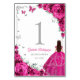 Fuchsienrosa silberne und weiße Quinceanera-Tischnummernkarten. Enthält ein Mädchen mit braunen Haaren im Ballkleid, Schriftart, silbernen Schmetterlingen, heißen rosa Rosen und Tiara. Perfekt für eine elegante Prinzessinnen-Glamour-Feier. Personalisieren Sie mit Ihren eigenen Details.