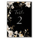 Eine elegante Tischnummer in Schwarz/Weiß zeigt ein romantisches Blumendesign mit schlichten, weißen Blume auf schwarzem Hintergrund. Machen Sie für jede Tischnummer eine separate Karte.