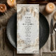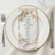 Erhöhen Sie den Empfang Ihres Luxus-Anwesens mit dieser anspruchsvollen Dinnerkarte, die ein romantisches, täuschend echtes Reliefdesign mit einem aufwendigen Torbogen und Glyzinien zeigt. Tauchen Sie Ihre Gäste in die Romantik eines europäischen Anwesens mit diesem kunstvoll gestalteten Design. Die visuelle Ästhetik ahmt die taktile Schönheit einer 3D-Basrelief-Skulptur nach, wiedergegeben in einer beruhigenden monochromen Farbpalette aus cremigem Elfenbein, weichem Beige und altem Off-Weiß. Ein aufwendiger architektonischer Torbogen, umrankt von hängenden Glyzinienblüten, rahmt eine ruhige pastorale Landschaft mit einer charmanten Brücke, Bäumen und einem Paar weißer Tauben, alle vereint durch eine simulierte weiße Putztextur. Der Text wird in einer Mischung aus klass