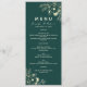 Mit diesem eleganten smaragdgrünen Hochzeitsmenü stärken Sie sich bei Ihrem Hochzeitsempfang. Das minimalistische Design mit goldblühenden Akzenten verleiht diesem Menü zeitlosen Charme und Eleganz. Lassen Sie Ihre Gäste durch eine kulinarische Reise mit dieser geschmackvollen Feier der Liebe und Tradition führen. Diese Karte ist auf hochwertigem mattem Papier gedruckt und verleiht Ihrem Tisch eine Touch der Verfeinerung. Passen Sie den Text einfach an Ihre Hochzeitsdetails an und schaffen Sie einen einheitlichen Look für Ihren besonderen Tag.