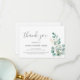 Einfach und elegant, ist dieses elegante Blumendesign der perfekte Weg, um Freunden und der Familie, die ein Familienmitglied geehrt haben, das vor kurzem verstorben ist, Ihre größte Dankbarkeit zu geben. Das Design umfasst handbemalte Grünflächen und goldene Eukalyptuszweige in Aquarellfarbe, einen passenden Rahmen und anpassbaren Text für Ihre Hochzeitsfeier. Ein großartiges Design für jede Gewerkschaft von zwei Personen. Auf der Rückseite ist eine solide, passende weiße Farbe erkennbar.